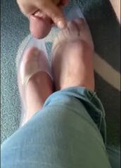 In transparent shoes cum on feet