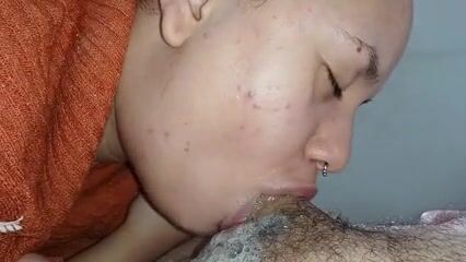 The bitch's nervous tongue licking the shaft of the dick, bubbling her spit with her hot blowjob