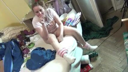 Crazy woman smokes and undresses while scavenging. Madness, disorder, laughter, striptease, cough.