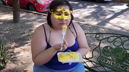 I suck my man's ass, cock and balls, extract a lot of cum and eat it with pineapple in public